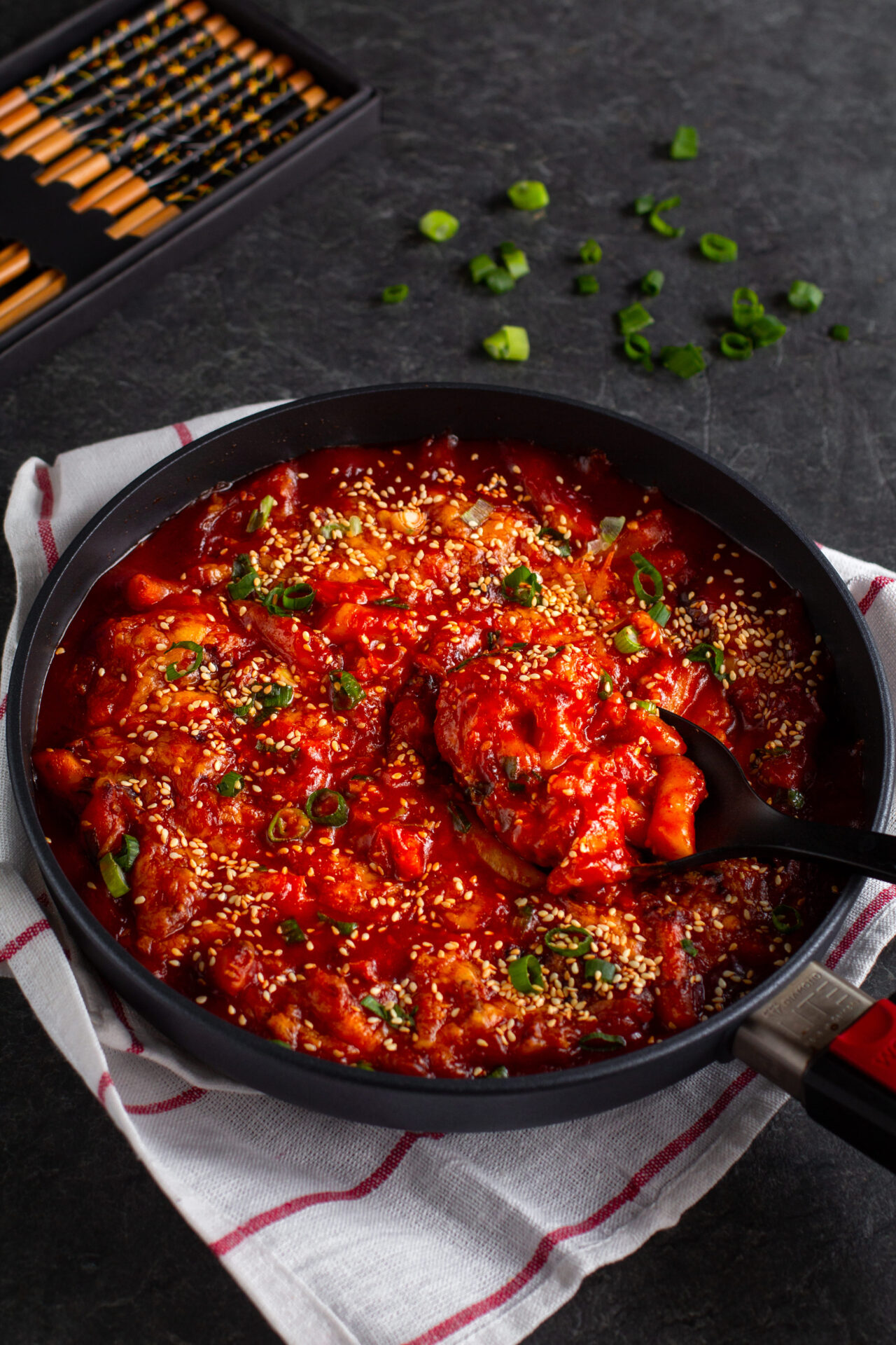 - Tteokbokki – ryżowe kopytka w pikantnym sosie z pasty gochujang zapiekane pod serem.