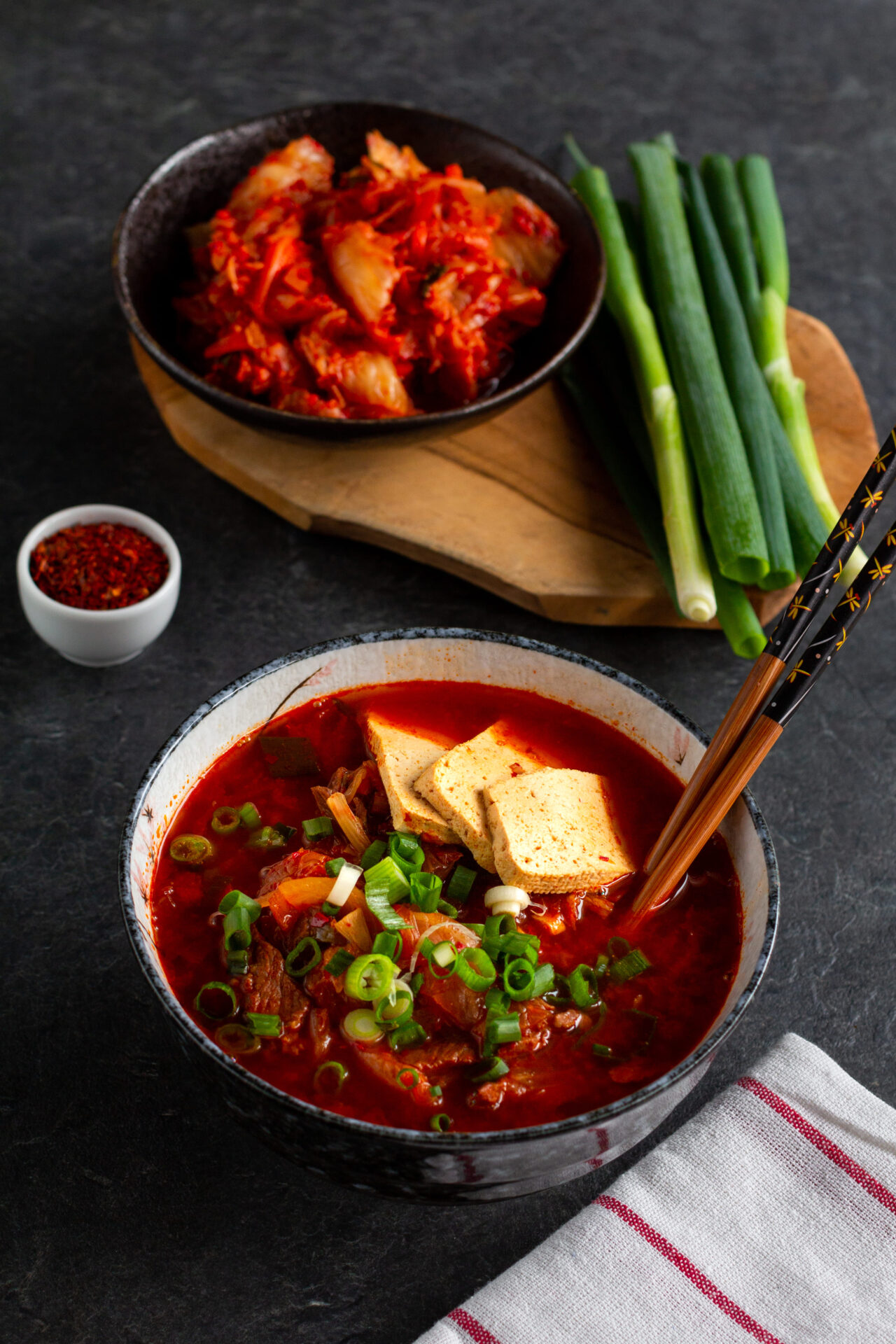 - Kimchi guk – rozgrzewającą koreańską zupę z kimchi oraz tofu.