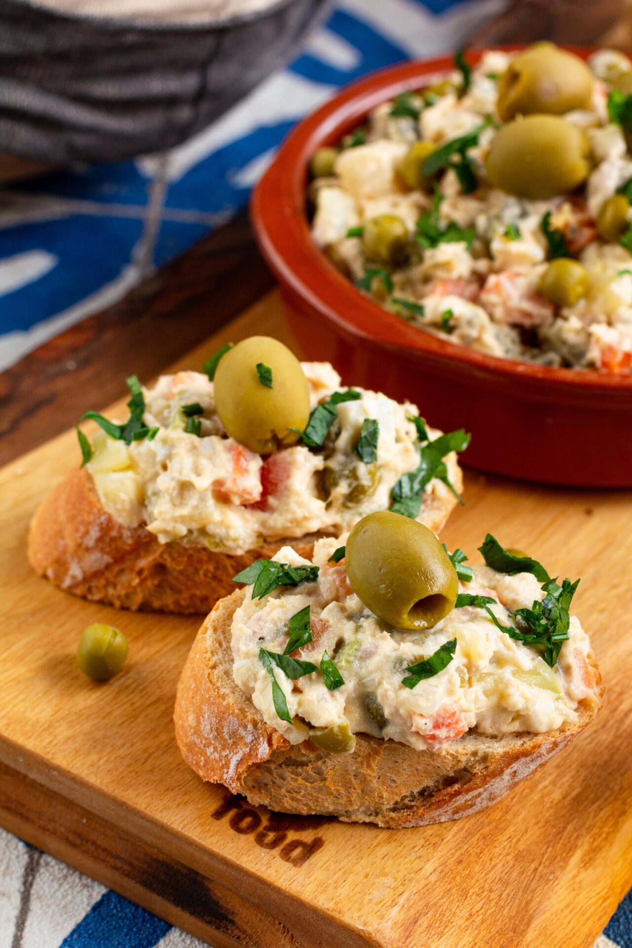 - Pintxos z ensaladilla rusa – kanapeczki z hiszpańską sałatką warzywną.
